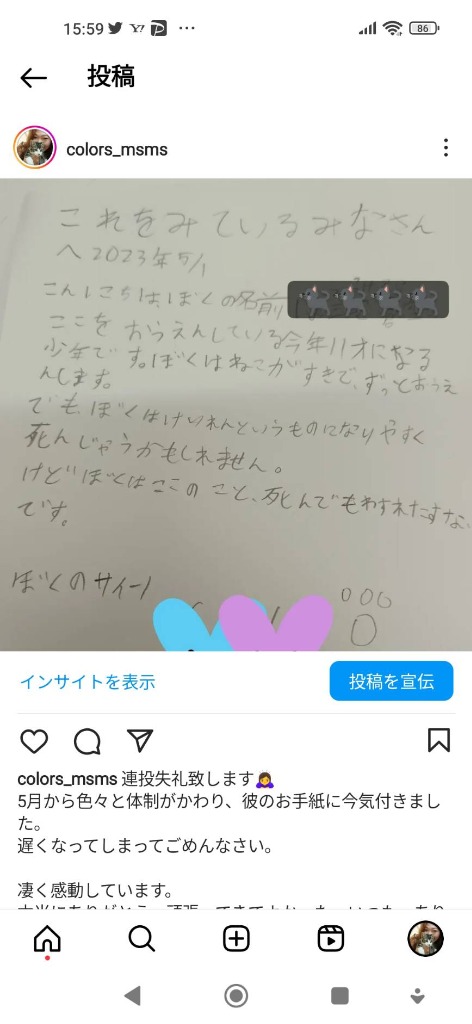 いつもしっかりご挨拶をしてくれて、必ず笑顔をくれます。手紙を受け取って感じた事をInstagramで書かせていただいてます。